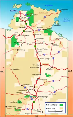 O Território do Norte possui uma rede conectada de estradas fechadas, incluindo duas rodovias nacionais, conectando-se aos estados vizinhos e conectando os principais centros populacionais do Território, além de outros importantes centros, como os parques nacionais de Uluru (Ayers Rock), Kakadu e Litchfield. A rodovia Stuart, outrora conhecida como "The Track", segue de norte a sul, conectando Darwin e Alice Springs a Adelaide na Austrália Meridional.[63] Algumas das estradas fechadas são de betume de pista única. Muitas estradas não pavimentadas conectam os assentamentos mais remotos.