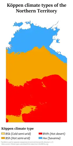 O Território do Norte possui duas zonas climáticas distintas. O extremo norte, incluindo Darwin, possui um clima tropical savânico (Aw),[24] com alta umidade e duas estações, a úmida que vai de outubro a abril, e a seca, que vai de maio a setembro. Durante a estação seca, quase todos os dias são quentes e ensolarados, e a umidade na tarde é em torno de 30%. Existe muito pouca pluviosidade entre maio e setembro. Nos meses mais frios de junho e julho, a temperatura mínima diária pode cair até 14 °C, mas muito raramente fica mais baixa, e geada nunca foi registrada.