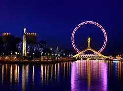 O arranha-céu Tianjin World Financial Center visto a partir do rio.