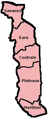 O Togo está dividido em 8 regiões administrativas e a comuna de Lomé, as regiões são: