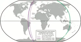 Inicialmente o meridiano de Tordesilhas não contornava o globo terrestre. Assim, Castela e Portugal podiam conquistar quaisquer novas terras que fossem os primeiros europeus a descobrir: Castela para Oeste do meridiano de Tordesilhas e Portugal para Leste desta linha, mesmo encontrando-se no outro lado do globo.[12][13] Mas a descoberta pelos portugueses em 1512 das valiosas "ilhas das Especiarias", as Molucas,[14][15] desencadeou a contestação espanhola, argumentando que o Tratado de Tordesilhas dividia o mundo em dois hemisférios equivalentes.