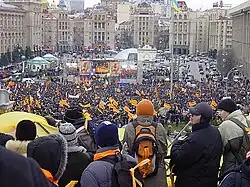 Em 2004, Viktor Yanukovych, então primeiro-ministro, foi declarado vencedor das eleições presidenciais, que tinham sido largamente manipuladas, como o Supremo Tribunal da Ucrânia constatou mais tarde.[70] Os resultados causaram um clamor público em apoio ao candidato da oposição, Viktor Yushchenko, que desafiou o resultado oficial do pleito. Isto resultou na pacífica Revolução Laranja, a qual foi reprimida violentamente, mas que trouxe Viktor Yushchenko e Yulia Tymoshenko ao poder, enquanto lançou Viktor Yanukovych à oposição.[71]