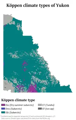 A maior parte do Yukon tem um clima subártico (Dfc, na classificação climática de Köppen), caracterizado por longos invernos frios e breves verões quentes. A costa do Oceano Ártico tem um clima de Tundra (ET). O clima é geralmente muito seco, com pouca precipitação, mas é consideravelmente mais úmido no sudeste. A precipitação é muito maior nas montanhas, e a neve continua a derreter bem no verão, resultando em água alta em julho ou agosto.[27]