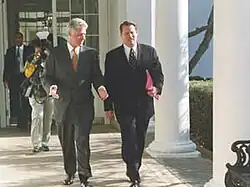 Clinton tem sido descrito como um novo democrata.[3] Algumas das suas políticas, como o Acordo de Livre Comércio Norte Americano e a reforma do bem-estar, têm sido atribuídas a uma terceira via centrista de filosofia de governação, enquanto em outras questões a sua posição foi de centro-esquerda.[4][5][6] Clinton presidiu o período mais longo de expansão econômica em tempos de paz da história americana.[7][8][9] O Escritório de Orçamento do Congresso informou um superávit orçamentário entre os anos de 1998 e 2000,[10] durante os últimos três anos da presidência de Clinton.[11] Após uma tentativa fracassada de reforma dos cuidados de saúde, os republicanos ganharam o controle da Câmara dos Representantes em 1994, pela primeira vez em 40 anos.[12] Dois anos depois, em 1996, Clinton foi reeleito e se tornou o primeiro membro do Partido Democrata desde Franklin D. Roosevelt a ganhar um segundo mandato como presidente.[13] Mais tarde ele foi acusado de perjúrio e obstrução da justiça em um escândalo envolvendo uma estagiária da Casa Branca, mas foi absolvido pelo Senado dos Estados Unidos e serviu o seu mandato completo.[14][15]