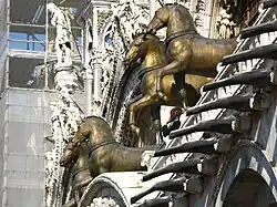 Os cruzados então saquearam, aterrorizaram e vandalizaram Constantinopla[11] por três dias, durante os quais muitas obras de arte gregas e romanas foram ou roubadas ou destruídas. Os famosos cavalos de bronze que decoravam o hipódromo foram parar na fachada da Basílica de São Marcos em Veneza, onde estão até hoje. Além de terem sido roubados, obras de valor inestimável foram destruídas apenas por seu valor material. Uma das mais preciosas obras a sofrer esse destino foi a enorme estátua de bronze de Hércules, criada pelo lendário Lísipo, escultor real de Alexandre, o Grande. Como muitas outras obras de bronze, foi derretida pelos cruzados, cegos por obter algum lucro imediato.[12]