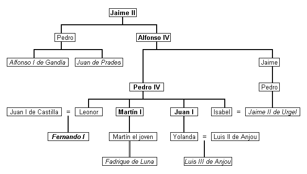 - Fernando de Trastámara, o de Antequera, infante de Castela, neto, pelo lado da mãe Leonor, de Pedro IV de Aragão.