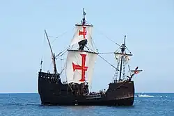Na noite de 3 de agosto de 1492, Colombo partiu de Palos de la Frontera, com três navios: uma nau maior, Santa María, apelidada Gallega, e duas caravelas menores, Pinta e Santa Clara, apelidada de Niña em homenagem a seu proprietário Juan Niño de Moguer.[62] Eram propriedade de Juan de la Cosa e dos irmãos Pinzón (Martín Alonso e Vicente Yáñez), mas os monarcas forçaram os habitantes de Palos a contribuir para a expedição. Colombo navegou inicialmente para as ilhas Canárias, que eram propriedade da Castela, onde reabasteceu as provisões e fez reparos. Em 6 de setembro, partiu de San Sebastián de la Gomera para o que acabou por ser uma viagem de cinco semanas através do oceano.