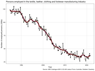Até a liberalização do comércio em meados da década de 1980, a Austrália tinha uma grande indústria têxtil. Este declínio continuou durante a primeira década do século XXI. Desde a década de 1980, as tarifas foram reduzidas constantemente; no início de 2010, as tarifas foram reduzidas de 17,5% para 10% em roupas e de 7,5 a 10% para 5% em calçados e outros têxteis.[9] A partir de 2010, a maior parte da fabricação de têxteis, mesmo por empresas australianas, é realizada na Ásia.