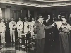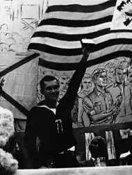 Cabo Anselmo discursa no palco da sede do Sindicato dos Metalúrgicos durante a Revolta dos Marinheiros, 25 de março de 1964 (Arquivo Nacional)