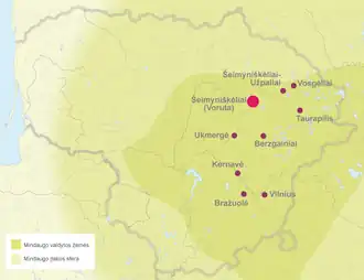 Domínio do Rei Mindaugas (amarelo escuro) durante os tempos do Reino da Lituânia, compõem o ducado inicial da Lituânia.