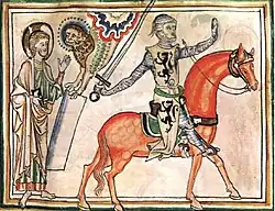 ![]() Cara de Dampierre montando um cavalo. Sua túnica leva as armas do condado de Flandres | |||||