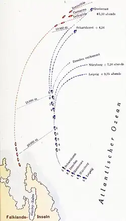 - ↑ a b c d e «Falkland Islands Museum & National Trust Website -World War 2» (em inglês). Falkland Islands Museum & National Trust. Consultado em 9 de agosto de 2013. Cópia arquivada em 13 de outubro de 2013