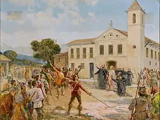 Desse modo, o Governo-Geral centralizou a administração colonial, subordinando as capitanias a um só governador-geral que tornasse mais rápido o processo de colonização. Em 1548, elaborou-se o Regimento do Governador-Geral,[48] que regulamentava o trabalho do governador e de seus principais auxiliares — o ouvidor-mor (Justiça), o provedor-mor (Fazenda) e o capitão-mor (Defesa).[49] O governador também levou ao Brasil os primeiros missionários católicos, da ordem dos jesuítas, como o padre Manuel da Nóbrega. Por ordens suas, ainda, foram introduzidas na colônia as primeiras cabeças de gado, de novilhos levados de Cabo Verde. Ao chegar à Bahia, Tomé de Sousa encontrou o velho Arraial do Pereira com seus moradores, e mudaram o nome do local para Vila Velha. Também moravam nos arredores o náufrago Diogo Álvares "Caramuru" e sua esposa Paraguaçu (batizada como Catarina), perto da capela de Nossa Senhora das Graças (hoje o bairro da Graça, em Salvador). Consta que Tomé de Sousa teria pessoalmente ajudado a construir as casas e a carregar pedras e madeiras para construção da capela de Nossa Senhora da Conceição da Praia, uma das primeiras igrejas erguidas no Brasil. Tomé de Souza visitou as capitanias do sul do Brasil, e, em 1553, criou a Vila de Santo André da Borda do Campo, transferida em 1560 para o Pátio do Colégio dando origem à cidade de São Paulo.[carece de fontes]
