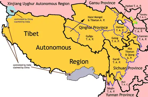 A República Popular da China estabeleceu subdivisões autônomas tibetanas na antiga província tibetana de Kham, U-Tsang e Amdo. Estas subdivisões estão em número de 13; com uma região autônoma, dez prefeituras e dois municípios.[43]