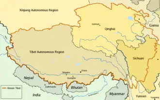 - ↑ Tibet, Tibet, A personal history of a lost land by Patrick French Arquivado em 3 de outubro de 2007, no Wayback Machine. French argues, for the Tibetans to base their claim on roughly the area of the current TAR, whose borders generally coincide with those of the de facto independent state between the two world wars.