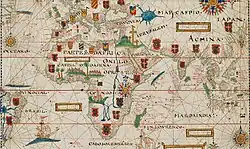 No Golfo Pérsico, os portugueses conquistam Ormuz em 1515 e, devido à posição estratégica na região, o Barém em 1521. Em 1522, o rei hindu de Sonda na Indonésia procurou selar uma aliança com os Portugueses em Malaca para se defender do aumento de poder muçulmano no centro de Java,[56] convidando-os a construir uma fortaleza no porto de Calapa (atual Jacarta). O Tratado de Sunda Kalapa (1522) foi selado com um padrão, mas os portugueses não conseguiriam cumprir a promessa de voltar no ano seguinte: nesse ano torna-se governador da Índia Duarte de Meneses que, após uma administração desastrosa, é enviado sob prisão para o reino e substituído por Vasco da Gama, que morreu em Cochim em 1524. Entre 1522 e 1529, na sequência da viagem de circum-navegação de Fernão de Magalhães, os castelhanos contestaram o limite Este do Tratado de Tordesilhas, disputando as valiosas Molucas "berço de todas as especiarias" e as Filipinas com os portugueses. Em 1529 João III e Carlos I de Espanha selaram o Tratado de Saragoça, que definia a continuação do meridiano de Tordesilhas no hemisfério oposto, a leste das ilhas Molucas, cedidas pela Espanha mediante o pagamento de 350 000 ducados de ouro.[57]