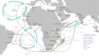 Marinheiros portugueses começaram a explorar a costa da África em 1419, utilizando os recentes desenvolvimentos em áreas como a navegação, a cartografia e a tecnologia marítima, como a caravela, com o objetivo de encontrar uma rota marítima para o lucrativo comércio de especiarias do oriente. Em 1488, Bartolomeu Dias dobrou o Cabo da Boa Esperança e, em 1498, Vasco da Gama chegou à Índia. Em 1500, Pedro Álvares Cabral chegou aos territórios na costa atlântica sul-americana, hoje parte do Brasil. Nas décadas seguintes, os marinheiros lusitanos continuaram a explorar o litoral e as ilhas do leste da Ásia, estabelecendo fortes e feitorias. Em 1571, uma série de postos avançados ligava Lisboa a Nagasáqui, no Japão, ao longo das costas da África, Médio Oriente, Índia e Ásia. Esta rede comercial trouxe grande riqueza para o Reino de Portugal.