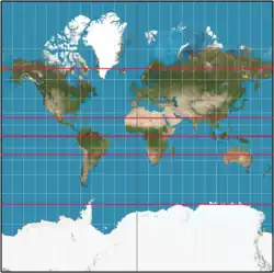 Em projeções de mapas não há uma regra universal sobre como os meridianos e paralelos devem aparecer. Os exemplos abaixo mostram os paralelos nomeados (como linhas vermelhas) na projeção de Mercator comumente usada e na projeção de Mercator Transversa. Na primeira, os paralelos são horizontais e os meridianos são verticais, enquanto na última não há relação exata entre paralelos e meridianos com horizontais e verticais: ambos são curvas complicadas.