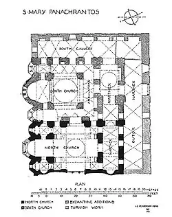 O complexo consiste em duas igrejas, de períodos e estilos diferentes, que estão lado a lado e se comunicam através de uma passagem em arco em sua parede comum, bem como na dos seus nártexes. Para mantê-las mais próximas foi adicionado ao complexo um exonártex que percorre todo o lado oeste, assim como uma galeria no lado sul.[15] Mesmo durante o período bizantino, ambas passaram por alterações. Algumas das principais evidências deste processo são o nártex irregular da Igreja Sul e suas capelas assimétricas. Além disso, na parede que os edifícios compartilham há indícios de que foram construídas diferentes estruturas.[16]