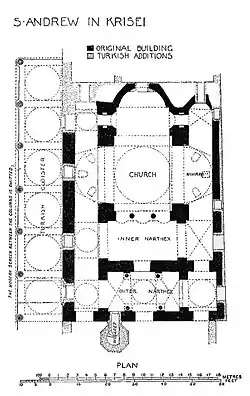 O edifício foi originalmente do tipo ambulatório, e é orientado na direção leste-nordeste - oeste-sudoeste. Tem uma cúpula central e três absides, colocados do lado leste. Um exo-nártex e um endo-nártex estão posicionados no lado oeste. Nos outros três lados a cúpula foi originalmente cercada por arcadas encimadas por abóbadas de berço. Durante o período otomano o edifício sofreu alterações importantes. A entrada fica no lado norte, onde os otomanos construíram uma galeria coberto por cinco cúpulas. Após o terremoto de 1766, a cúpula central foi reconstruída. É circular no interior, octogonal no exterior, e apoia-se sobre um tambor perfurado por oito janelas.[11]