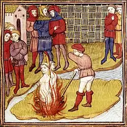 No adro da Igreja de Notre-Dame, em Paris, fora instalado um cadafalso, para no dia 18 de março de 1314 anunciar a sentença de prisão perpétua aos cavaleiros Tiago de Molay, Hughes de Pairaud, Geoffroy de Charnay e Geoffroy de Gonneville. Em meio ao anúncio da sentença, De Molay e Geoffroy de Charnay levantaram-se bradando sua inocência e a de todos os Templários, que todos os crimes e heresias a eles atribuídos foram inventados. No mesmo dia, armou-se uma fogueira próxima ao jardim do palácio onde foram queimados Tiago de Molay e Geoffroy de Charnay.[45]