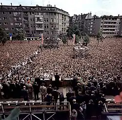 Em 4 de junho de 1961, o presidente se encontrou com Khrushchev, onde deixou claro que qualquer tratado entre Berlim Oriental e a União Soviética que interferisse nos direitos de acesso dos EUA em Berlim Ocidental seria considerado um ato de guerra.[39] Os dois líderes também discutiram a situação no Laos, a crise do Congo, o incipiente programa nuclear da China, um possível tratado de proibição de testes nucleares e outras questões.[40] Pouco depois de Kennedy voltar para casa, a União Soviética anunciou sua intenção de assinar um tratado com Berlim Oriental que ameaçaria o acesso ocidental a Berlim Ocidental. Kennedy, deprimido e irritado, assumiu que sua única opção era preparar o país para uma guerra nuclear, que ele pessoalmente achava que tinha uma chance em cinco de ocorrer.[39]