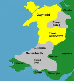 Gales c. 1217. Amarelo: áreas diretamente governadas por Llywelyn; Cinza: áreas governadas pelos vassalos de Llywelyn; Verde: domínios dos lordes anglo-normandos em Gales.