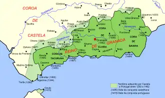 ![]() Mapa do Reino de Granada com algumas datas de conquistas cristãs