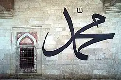 A representação visual mais comum de Maomé na arte islâmica, especialmente nas áreas de língua árabe, é por uma representação caligráfica de seu nome, uma espécie de monograma em forma aproximadamente circular, muitas vezes, num quadro decorado. Tais inscrições são normalmente em árabe, e podem reorganizar ou repetir formas, ou adicionar uma bênção ou honorífico, ou por exemplo, a palavra "mensageiro" ou uma contração do mesmo. A variedade de formas de representar o nome de Maomé é considerável; ele também é freqüentemente simbolizado por uma rosa.
