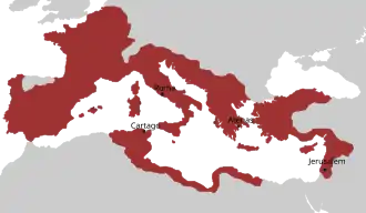 Roma Antiga foi uma civilização itálica que surgiu no século VIII a.C. Localizada ao longo do mar Mediterrâneo e centrada na cidade de Roma, na península Itálica, expandiu-se para se tornar um dos maiores impérios do mundo antigo,[1] com uma estimativa de 50 a 90 milhões de habitantes (cerca de 20% da população global na época[2][3]) e cobrindo 6,5 milhões de quilômetros quadrados no seu auge entre os séculos I e II.[4][5][6]