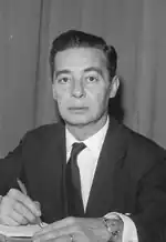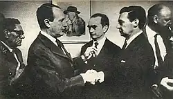 ![]() Auro de Moura Andrade (dir.) empossa Ranieri Mazzilli (esq.) na Presidência após a declaração de vacância | |