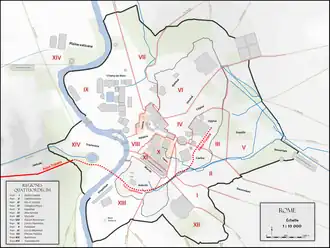 Mapa da Água Trajana em Roma com o trecho conjectural pontilhado em vermelho.