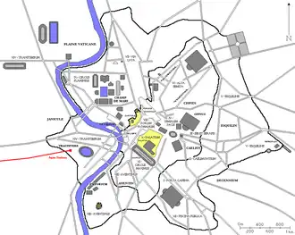 Mapa da Água Trajana em Roma (trecho conhecido) em vermelho.