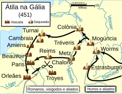 A Gália encontrava-se abalada por revoltas, e Átila esperava que a sociedade que unia os romanos e os visigodos não fosse respeitada, permitindo-lhe enfrentar seus inimigos separadamente ou convencer um deles a unir-se a ele.[139] Átila sitiou a atual Métis, que recusou render-se. Meses depois, em 7 de abril de 451, o muro sul da cidade caiu e os hunos, exasperados por um longo cerco, massacraram a população local.[140] Paris foi poupada, e uma anedota hagiográfica afirma que Santa Genoveva, através de suas orações, a teria salvado.[141]