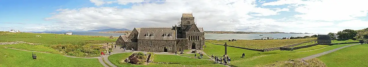 Em 563, Columba chegou em Iona partindo da Irlanda com doze companheiros e fundou ali um mosteiro que cresceu até se tornar um influente centro para a expansão do cristianismo entre os pictos e os escotos. Reis foram coroados e sepultados em Iona. Acredita-se que o Livro de Kells, um famoso manuscrito iluminado, tenha sido produzido pelos monges em Iona nos anos finais do século VIII.[1] Em 806 , os viquingues massacraram 68 monges na Baía dos Mártires e os monges de Columba retornaram para a Irlanda e para um mosteiro em Kells, enquanto os demais fugiram dali para fundarem mosteiros na Bélgica, França e na Suíça.[2] Em 825, São Blathmac e os monges que retornaram com ele para Iona foram martirizados por um novo ataque viquingue e abadia foi incendiada. Porém, é provável que não tenha sido de todo abandonada. Sua continuada importância é demonstrada pela morte ali, em 980, de Amlaíb Cuarán, um aposentado rei de Dublin.