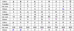 Este alfabeto foi criado no final do século IV por Ulfila, bispo dos godos instalados no curso do Danúbio. Cada letra do alfabeto possui um valor numérico. Para sobressair os sons que o grego não possuía, Ulfila recorreu aos signos rúnicos para atingir tal objetivo.