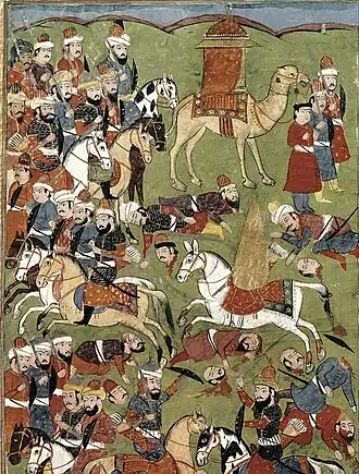 O curto califado de Ali (656-661) foi repleto de lutas sangrentas. Durante este período, ele realizou três guerras. O primeiro conflito foi em Basra com os Nakisin, ou aqueles que se retiraram, ou seja, Aixa e Talha e Zubair. Isso foi chamado de Batalha do Camelo, porque Aixa estava montada em um camelo. Após esta batalha, ele foi forçado a deixar Medina e recuar para o Iraque, onde se estabeleceu na cidade de Cufa (al-Kûfa) no Eufrates, uma cidade de guarnição árabe da época da conquista. O segundo conflito foi com os Kasitin, aqueles que agiram injustamente, ou os Separatistas, ou seja, Moáuia e seus partidários. A terceira luta foi com os Mariqin, os hereges, que eram os Carijitas, ou rebeldes. Esta batalha foi travada no vale de Nahravan. Portanto, a maior parte dos dias do califado de Ali foram gastos na superação da oposição interna. Finalmente, na manhã do dia 19 do Ramadã do ano 40 A.H., enquanto rezava na mesquita de Cufa, ele foi ferido por um dos Carijitas e morreu como mártir durante a noite do dia 21.