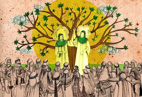 Um episódio que tem recebido grande destaque nas obras xiitas é chamado de episódio da Mubahala. Os relatos xiitas usuais desse episódio são os seguintes: Maomé, no nono ano da Hégira, enviou uma série de cartas aos governantes próximos, convocando-os a aceitar o Islã. Em Najran, que era uma cidade cristã na rota entre Medina e o Iêmen, os líderes se reuniram para decidir o que deveriam fazer. Após alguma discussão, foi apontado que Jesus havia profetizado o Paráclito ou Consolador, cujo filho conquistaria a Terra. No entanto, sentiu-se que isso não poderia se referir a Maomé, que não tinha filho. Então um grande livro chamado al-Jami' foi consultado, contendo os escritos e tradições de todos os profetas. Neste livro foi encontrada referência a como Adão teve uma visão de uma luz brilhante cercada por outras quatro luzes e foi informado por Deus que estes eram cinco de seus descendentes. Coisas semelhantes foram encontradas nos escritos de Abraão, Moisés e Jesus. E assim, foi decidido enviar uma delegação de seus eruditos a Medina para averiguar a verdade. Em Medina, depois de um grande debate, decidiu-se envolver em Mubahala (maldição mútua), referindo o assunto a Deus e invocando a maldição de Deus sobre quem era o mentiroso. Foi nessa época que o verso de Mubahala (Alcorão 3:61) foi revelado. O concurso foi marcado para o dia seguinte e toda a gente de Medina veio testemunhar. Maomé saiu com apenas Ali, Fatima, Haçane e Huceine e eles ficaram sob um manto. Os cristãos perguntaram a Maomé por que ele não havia trazido os líderes de sua religião e Maomé respondeu que Deus havia ordenado isso. Então os cristãos se lembraram do que leram em al-Jami' e se convenceram de que Maomé era a figura profetizada por Jesus. Os cristãos desistiram do concurso e concordaram em prestar homenagem. A partir desse episódio, Maomé, Ali, Fátima, Haçane e Husayn ficaram conhecidos como Ahl al-Kisa (o povo do manto). [24]