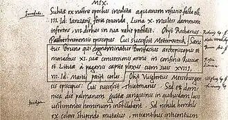 | “ | Sanctus Bruno qui cognominatur Bonifacius archepiscopus et monachus XI. suæ conuersionis anno in confinio Rusciæ et Lituæ a paganis capite plexus cum suis XVIII, VII. Id. Martij petijt coelos.