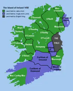 Os barões anglo-normandos também se assentaram na Irlanda a partir do século XII. Inicialmente fizeram-no para apoiar a reis regionais irlandeses como Diarmuid MacMorrough (cujo nome em moderno inglês é Dermot MacMurrough). Richard de Clare, Segundo Conde de Pembroke e conhecido como Strongbow (arco forte) foi o líder dos cavaleiros anglo-normandos que MacMurrough solicitou a Henrique II de Inglaterra para lhe ajudar a se restabelecer a si mesmo no poder como Rei de Leinster. Strongbow morreu pouco tempo após a invasão na Irlanda, mas os homens que lhe acompanhavam permaneceram na ilha para apoiar a Henrique II de Inglaterra e a seu filho João (John) como Senhor da Irlanda.