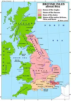 Em 660, o mapa político da Baixa-Bretanha se desenvolveu com territórios menores que se agrupavam em reinos, desde então reinos maiores começaram a dominar os reinos menores. O desenvolvimento dos reinos, com um rei em particular sendo reconhecido como um senhor superior, desenvolvido a partir de uma estrutura inicial que, segundo Higham, está vinculada de volta ao feodus original.[49] O nome tradicional para este período é Heptarquia, que não tem sido utilizada por estudiosos desde o início do século XX,[37] pois dá a impressão de uma única estrutura política e não oferece a "oportunidade de tratar a história de qualquer reino como um todo".[50] Simon Keynes sugere que o século VIII e IX foi um período de prosperidade econômica e social que criou estabilidade tanto abaixo do Tâmisa quanto acima do Humber. Muitas áreas floresceram e sua influência foi sentida em todo o continente, no entanto, entre o Humber e o Tâmisa, uma entidade política cresceu em influência e poder e para o Oriente, e esses desenvolvimentos na Grã-Bretanha atraíram atenção.[50]