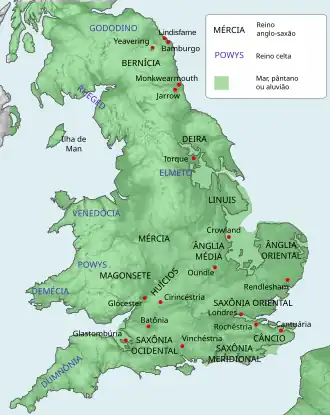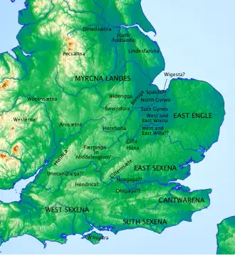 A Terra Média-Baixa da Grã-Bretanha era conhecida como o lugar do Mierce, o povo fronteiriço, em latim, Mercia. Mércia era uma área diversificada de grupos tribais, como mostra o Hidas da Inglaterra; os povos eram uma mistura de povos de fala britônica e pioneiros "anglo-saxões" e seus primeiros líderes tinham nomes britônicos, como Penda.[37] Embora Penda não apareça na lista de grandes senhores de Beda, ele apareceria quando Beda diz em outro lugar que dominava os reinos do sul. Na época da batalha do rio Vinuedo, trinta duces regii (generais reais) lutaram em seu nome. Embora haja muitas lacunas nas evidências, é claro que os reis da Mércia do século VII eram formidáveis governantes que conseguiram exercer uma ampla dominação de sua base em Midland.