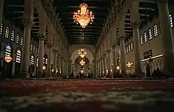 Na Síria, os omíadas preservaram o conceito geral de um pátio cercado por pórticos, com um santuário mais profundo, que havia sido desenvolvido em Medina. Em vez de fazer do santuário um salão hipostilo, como foi feito no Iraque, eles o dividiram em três corredores. Isso pode ter sido derivado da arquitetura da igreja, embora todos os corredores tivessem a mesma largura. [3] Na Síria, as igrejas foram convertidas em mesquitas bloqueando a porta oeste e fazendo entradas na parede norte. A direção da oração era para o sul em direção a Meca, então o eixo longo do edifício estava em ângulos retos com a direção da oração. [14]