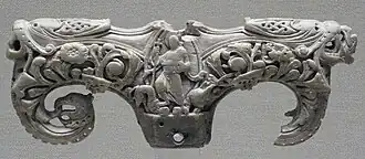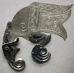 - ↑ A arte de estilo animal é uma abordagem da decoração encontrada da China ao norte da Europa no início da Idade do Ferro, e a arte bárbara do período de migração, caracterizada por sua ênfase em motivos de animais.