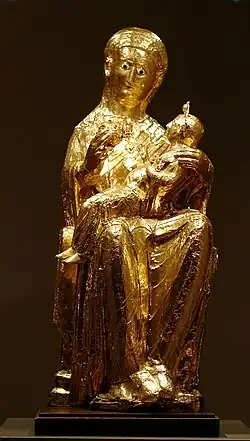 No último século do período registram-se algumas grandes figuras em metais preciosos; presumivelmente, eram feitas de folhas finas sobre um núcleo de madeira como a Madona Dourada de Essen, o maior exemplo desse tipo de figura do início da Idade Média a sobreviver em qualquer lugar da Europa. Estes parecem ter sido em tamanho natural, ou quase isso, e eram principalmente crucifixos, às vezes com figuras de Maria e João Evangelista em ambos os lados. O patrocínio das grandes figuras da terra e dos maiores mosteiros tornou-se extravagante neste período, e as maiores igrejas anglo-saxônicas tardias devem ter apresentado um espetáculo deslumbrante, um pouco no estilo das igrejas ortodoxas orientais. O gosto anglo-saxão deleitava-se com materiais caros e os efeitos da luz em metais preciosos, que também eram bordados em tecidos e usados em pinturas murais.[26] Seções de elementos decorados de algumas grandes obras saqueadas, como relicários, foram serradas por invasores vikings e levadas para casa para suas esposas usarem como joias, e várias delas sobrevivem em museus escandinavos.