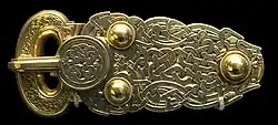 Da própria Inglaterra, a Joia Alfred, com face esmaltada, é a mais conhecida de um grupo de joias litúrgicas finamente trabalhadas, e há uma série de broches de disco de alta qualidade. Os mais ornamentados dos anteriores são coloridos e complicados com incrustações e filigranas, mas o Tesouro de Pentney do século IX, descoberto em 1978, continha seis esplêndidos broches em prata plana vazados no "estilo Trewhiddle".[nota 4] Nesses, animais pequenos, mas totalmente formados, de espécies não reconhecíveis, contorcem-se em folhagens e gavinhas que se entrelaçam, mas sem a geometria enfática do estilo "fita" anterior.[28] O broche de Ædwen, um broche de disco de prata anglo-escandinavo do século XI, mostra influência da arte viking e uma queda dos mais altos padrões anteriores de fabricação.