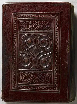 A capa de couro decorada única do pequeno Evangelho de São Cuteberto da Nortúmbria, a mais antiga encadernação ocidental a sobreviver inalterada, pode ser datada de 698 ou pouco antes. Utiliza linhas incisas, algumas cores e decoração relevada construída sobre cordões e gesso ou peças de couro.