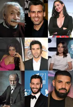 Do canto superior esquerdo para direita: Albert Einstein, Oded Fehr, Gal Gadot, Amy Winehouse, Sacha Baron Cohen, Mila Kunis, Sigmund Freud, Adam Tsekhman e Drake