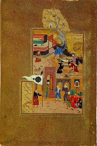 Coleção no Metropolitan Museum of Art, Nova York. Fólio de um manuscrito ilustrado datado de c. 1600. Pinturas de Habiballah de Sava (ativo c. 1590-1610), em tinta, aquarela opaca, ouro e prata em papel, dimensões 25,4 x 11,4 cm.[25]
