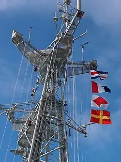 Mastro com verga e carangueja, arvorando a bandeira da Alemanha na carangueja, bem como outras bandeiras na verga e no tope.